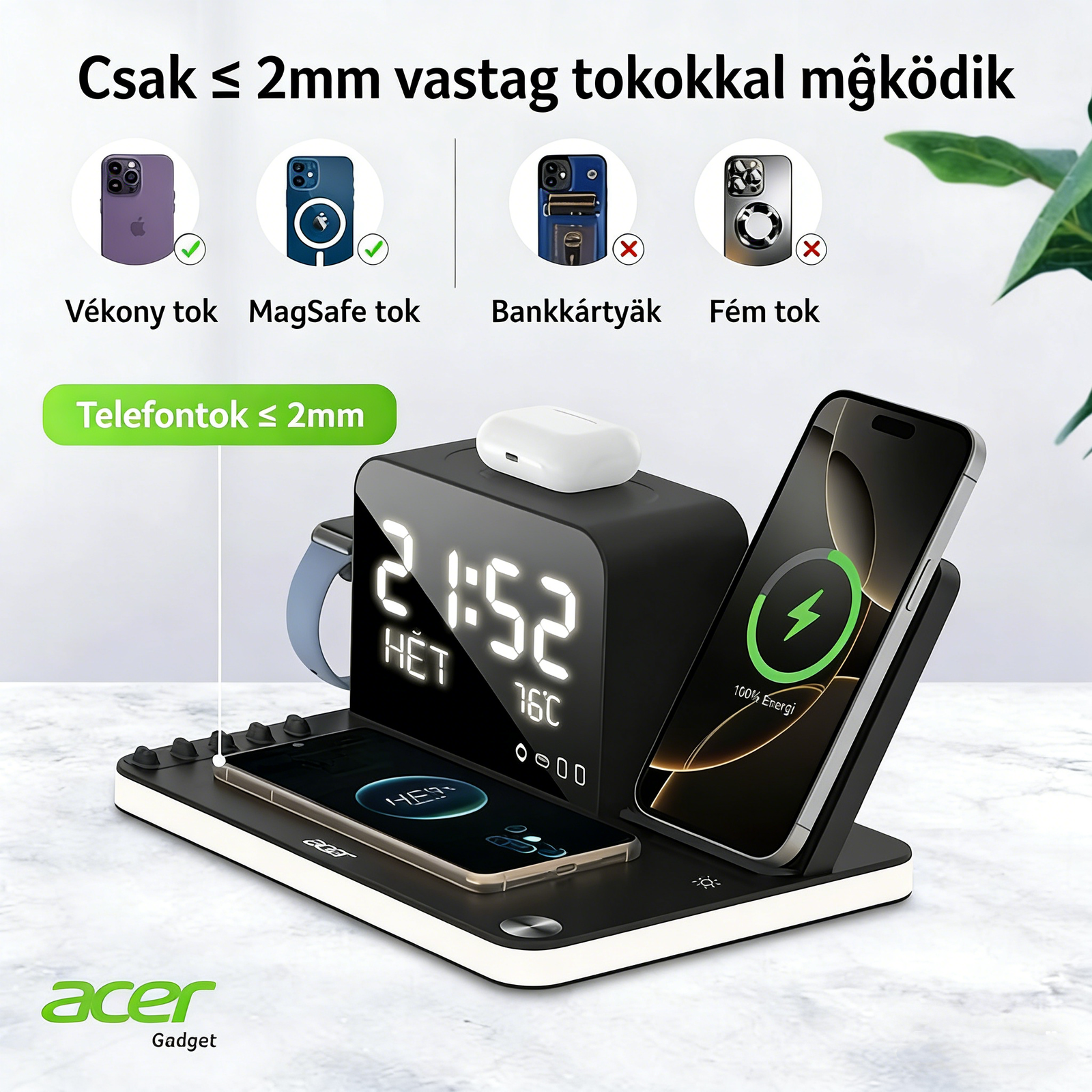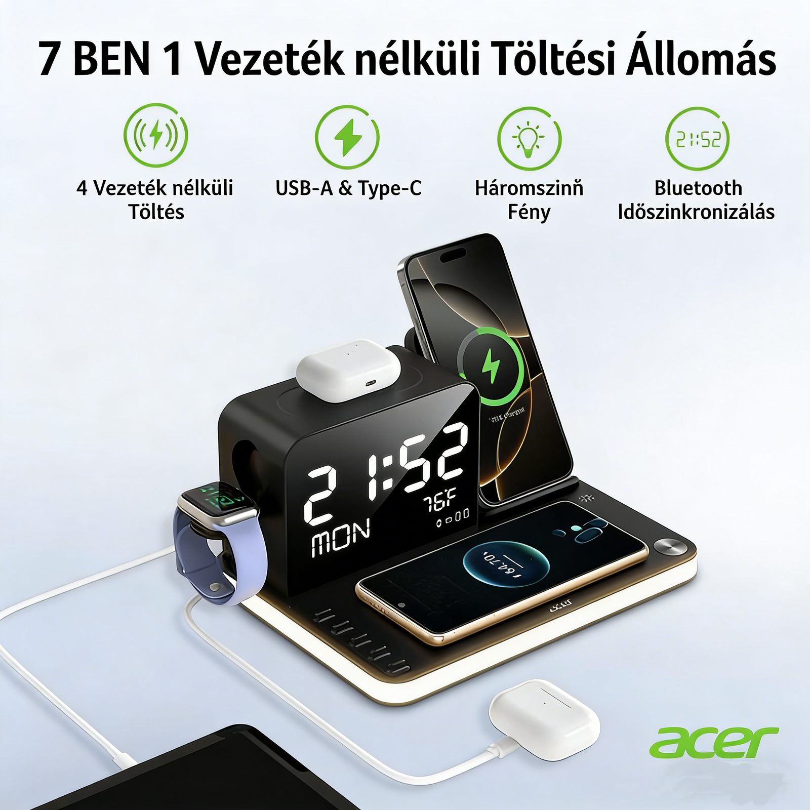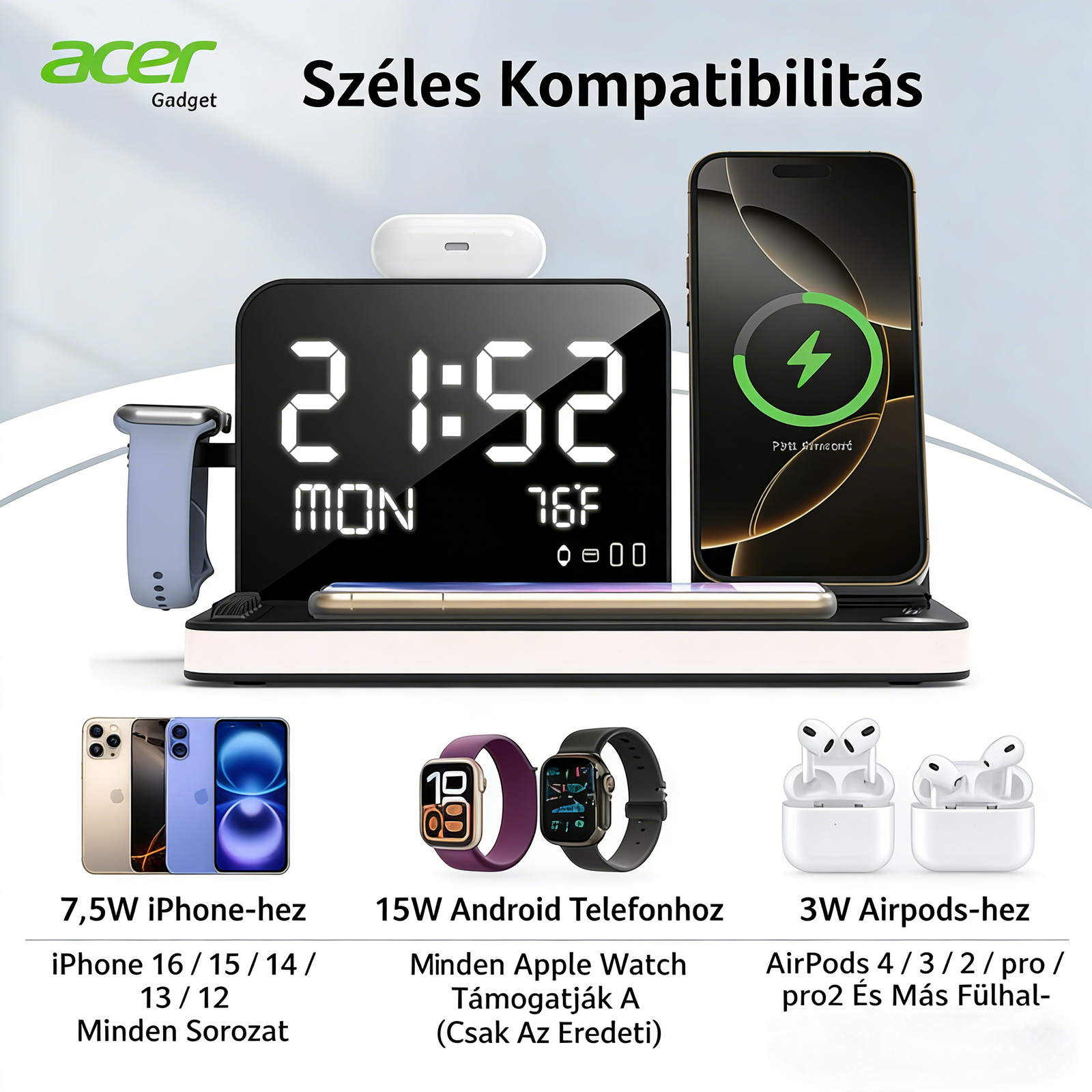 • Teljes kompatibilitás – Tökéletesen működik Acer eszközökkel, valamint iPhone, Samsung, AirPods, Apple Watch és más vezeték nélküli töltést támogató eszközökkel.