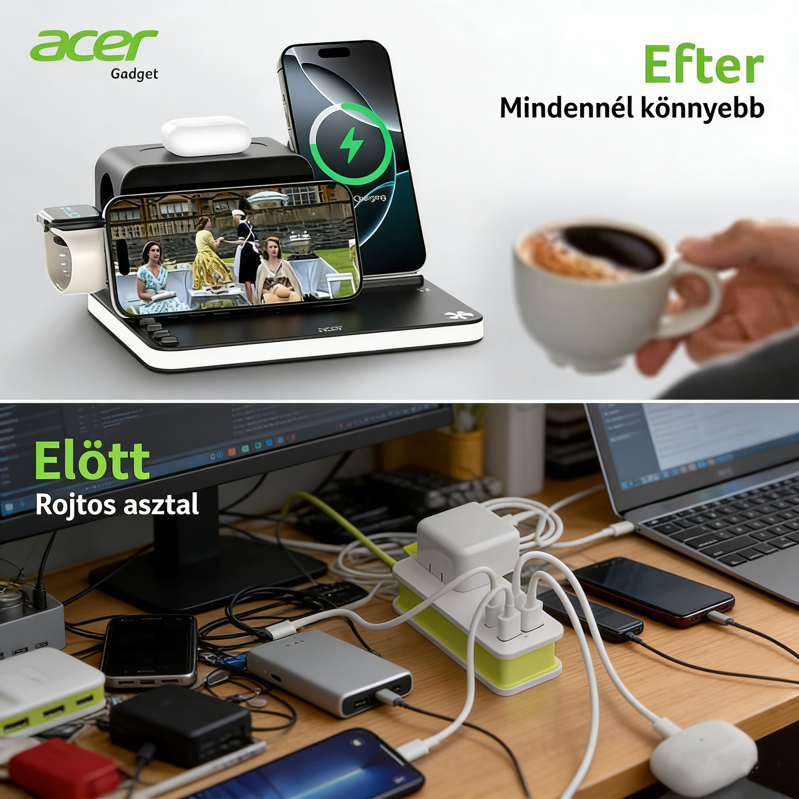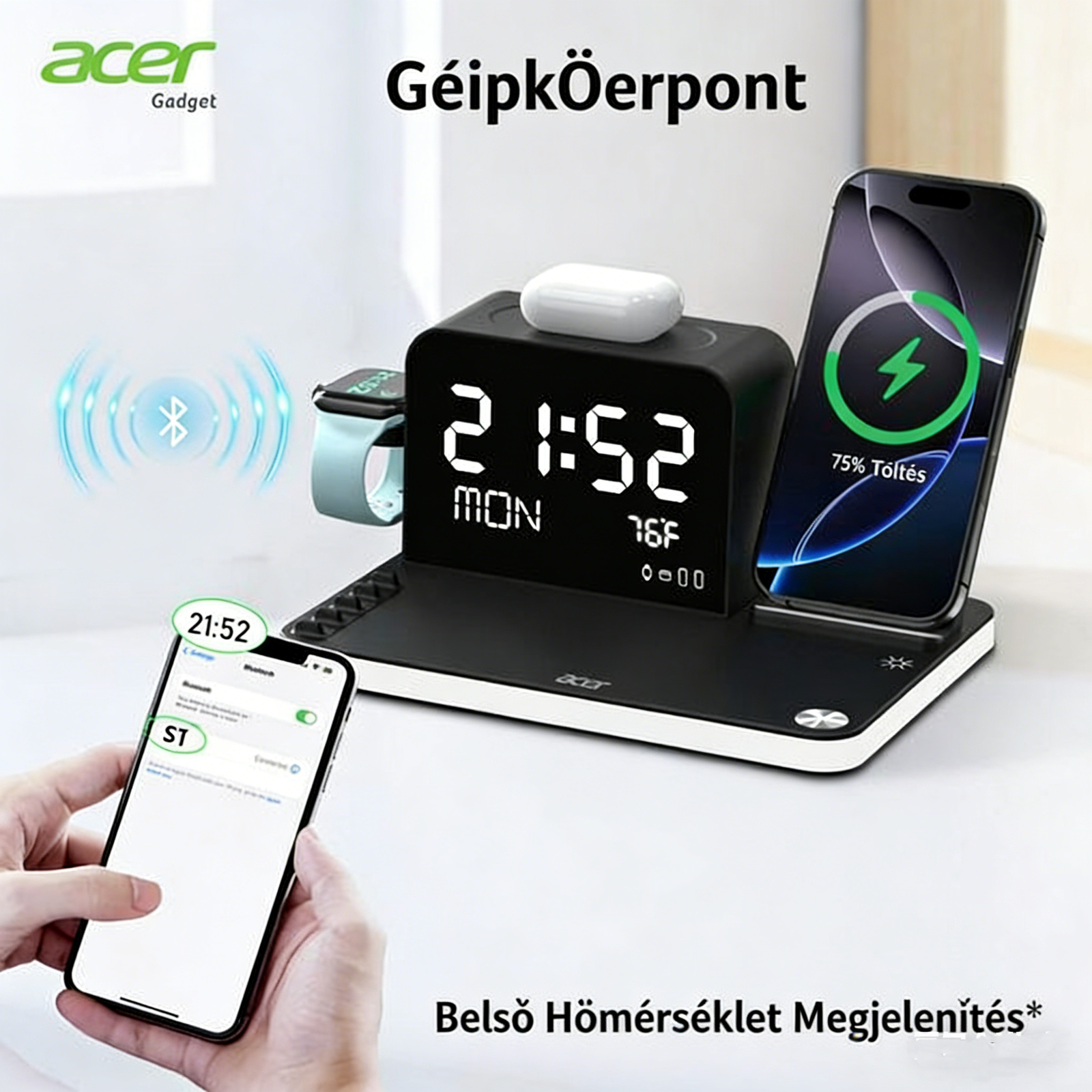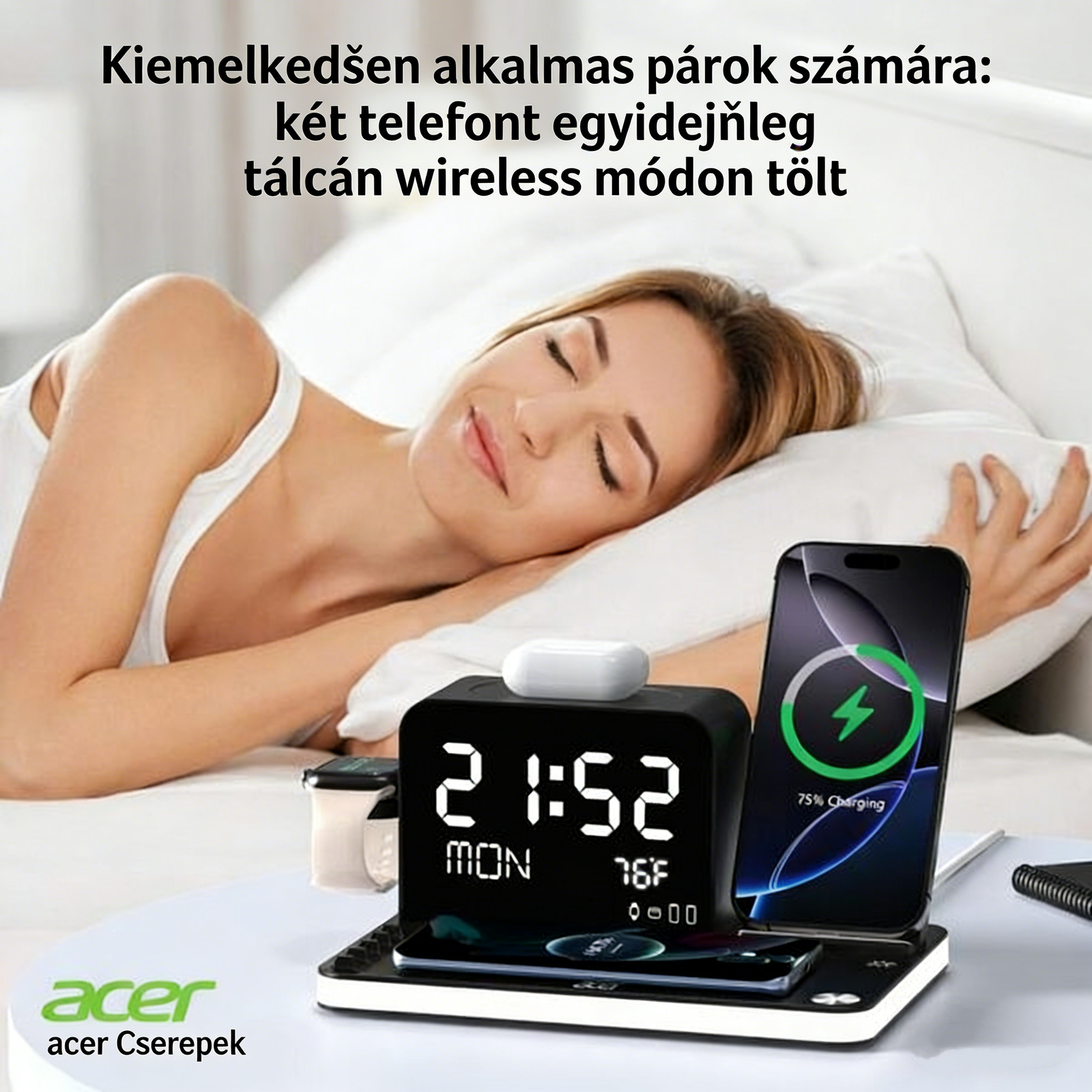 • Teljes kompatibilitás – Tökéletesen működik Acer eszközökkel, valamint iPhone, Samsung, AirPods, Apple Watch és más vezeték nélküli töltést támogató eszközökkel.